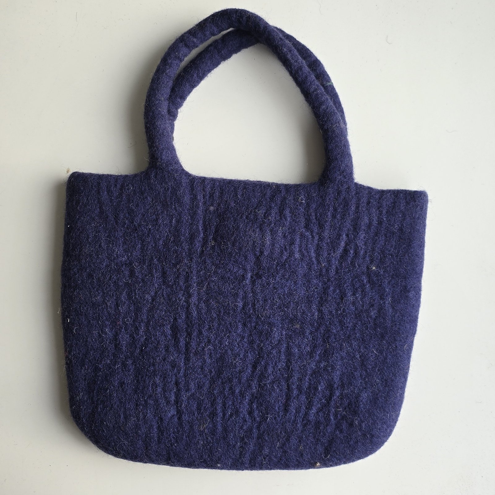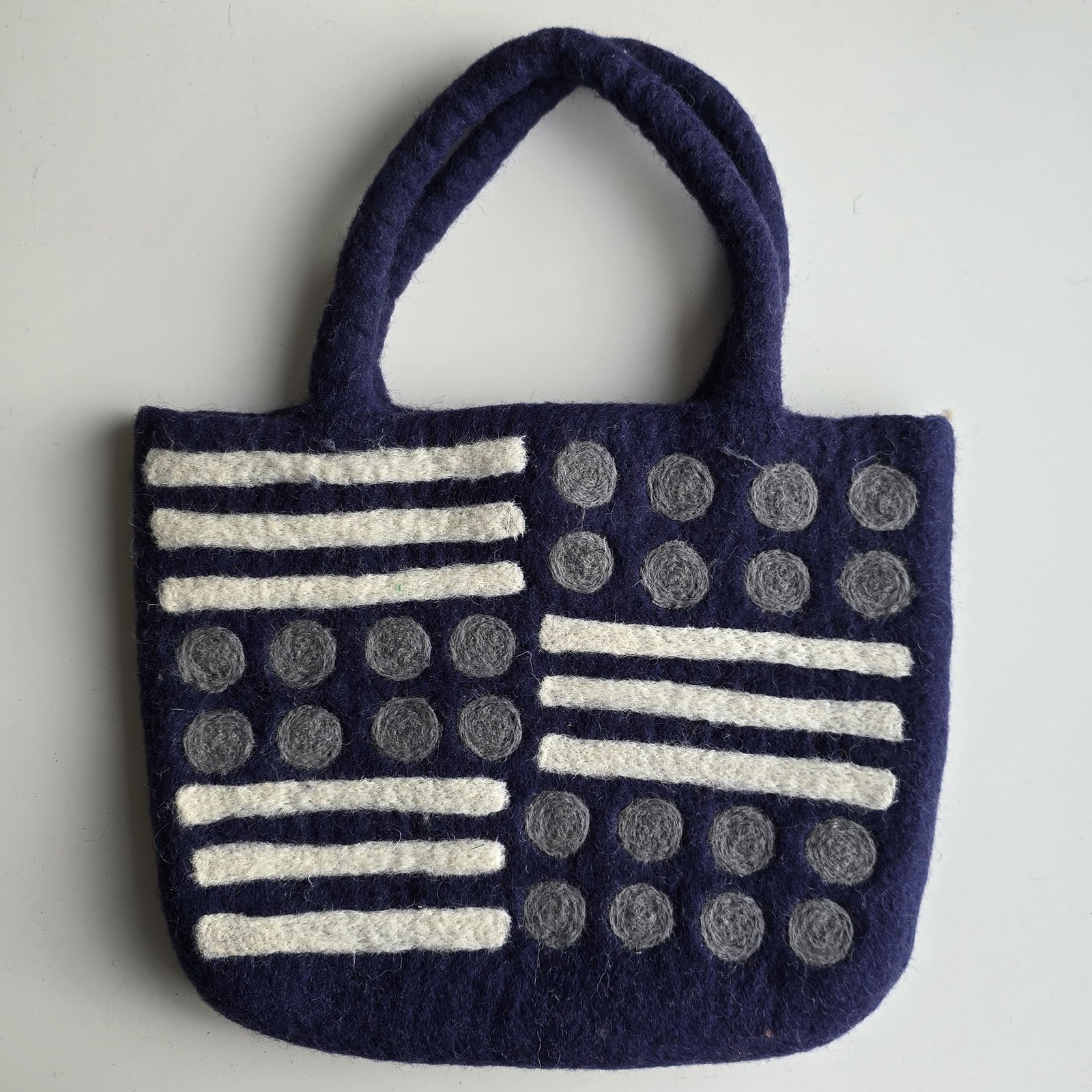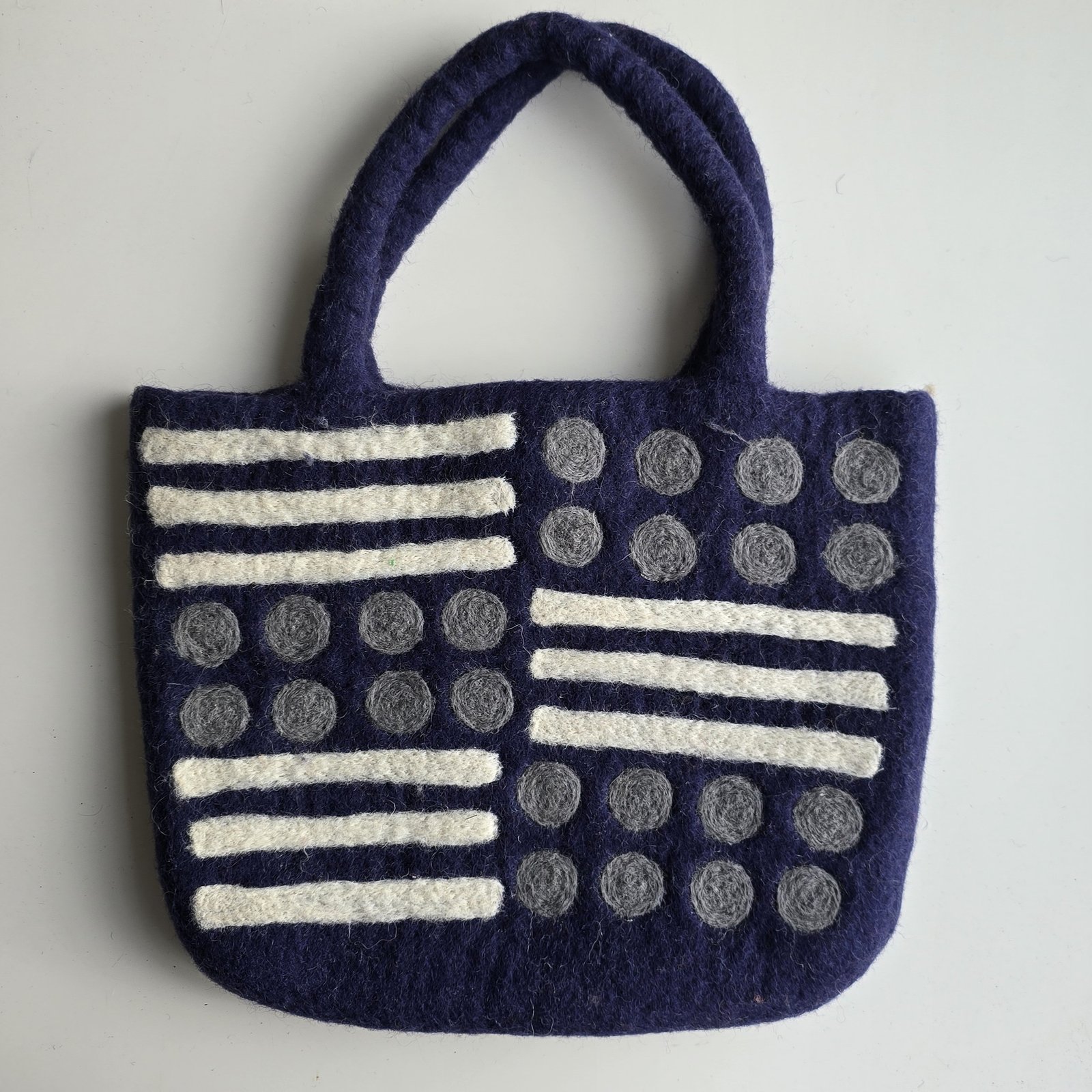 The Indigo Geo Felt Bag features bold geometric patterns in soft grey and ivory on deep indigo felted wool. Handcrafted from natural wool, it is lightweight, durable, and finished with comfortable handles—perfect for everyday use with a modern, artisanal touch.