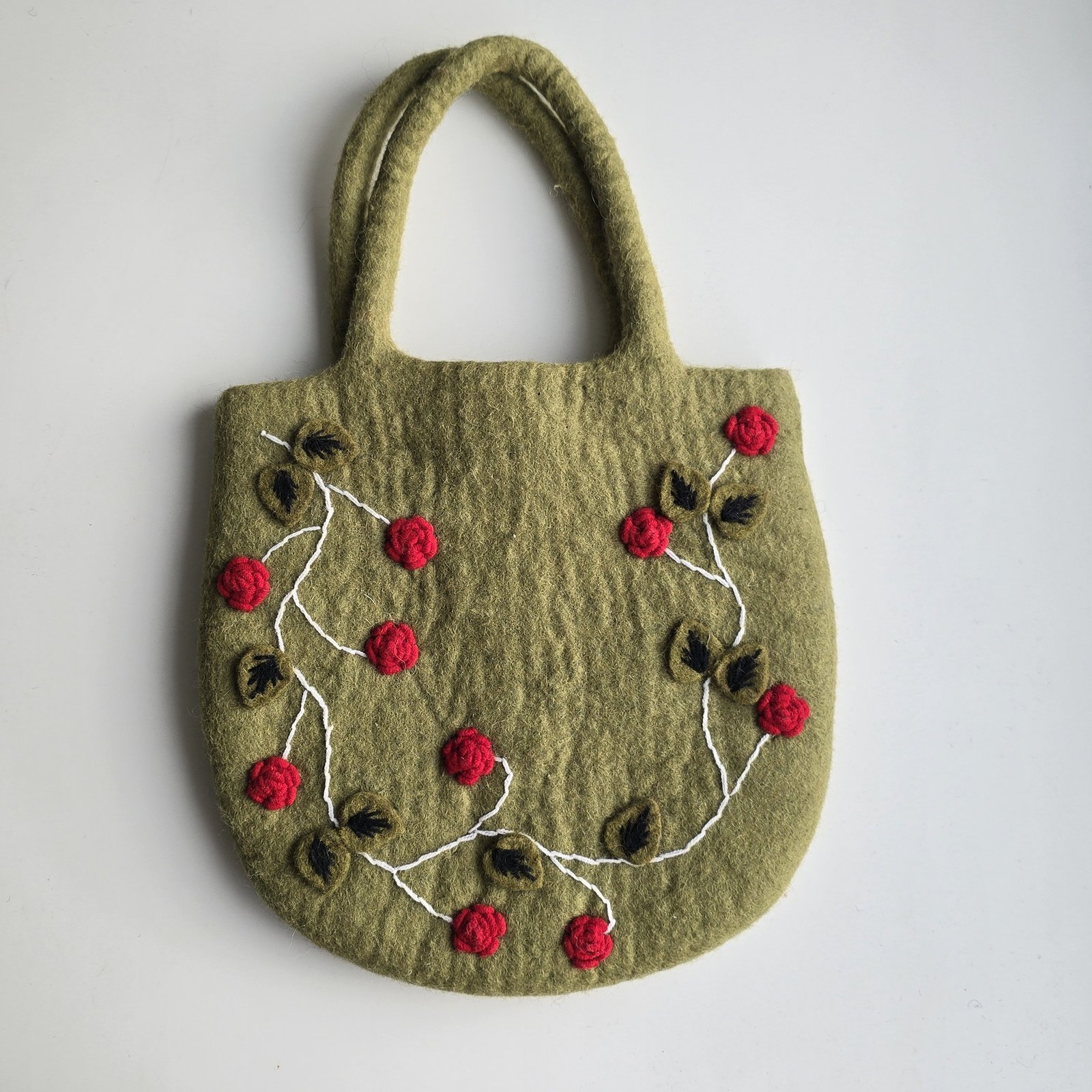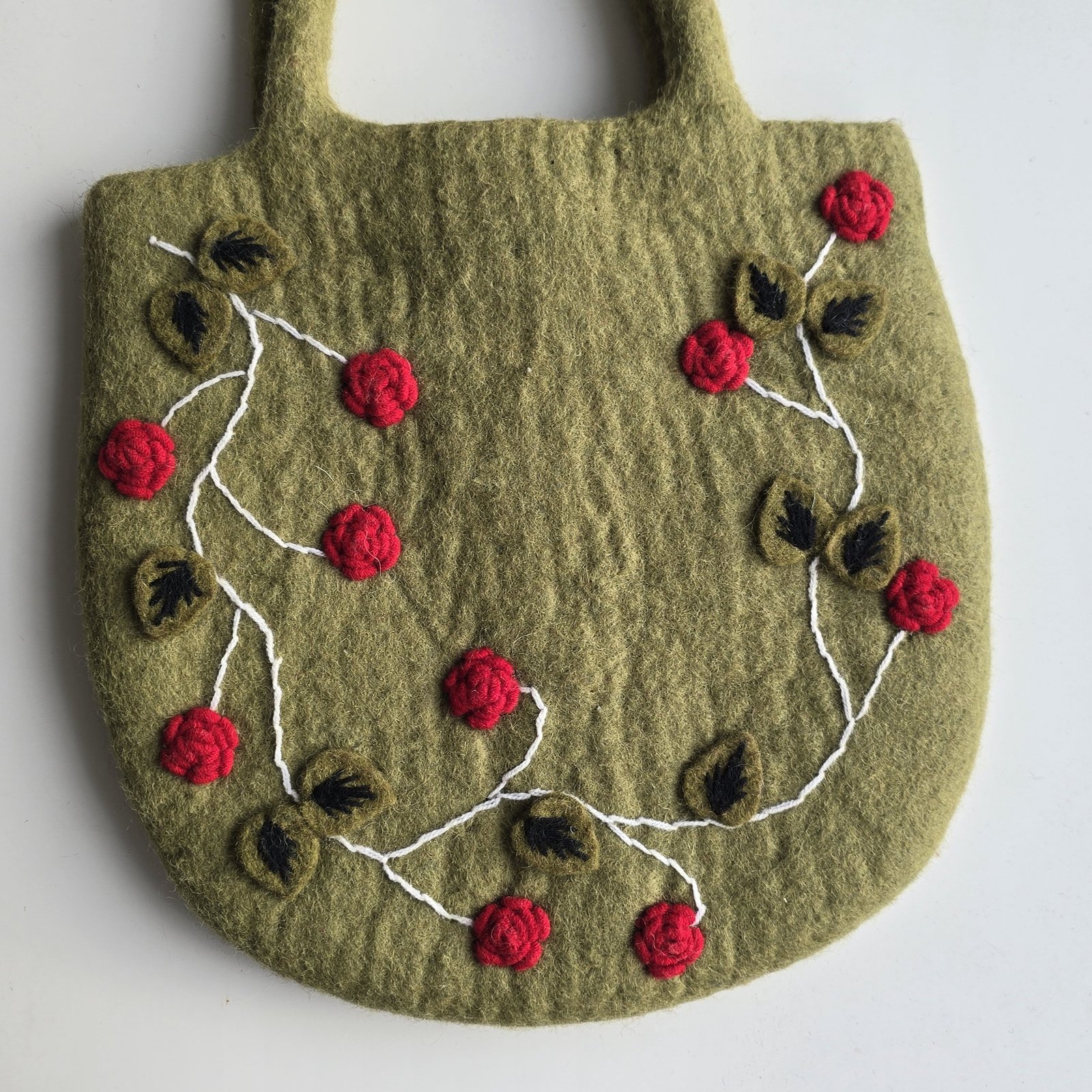 The Olive Rose Felt Bag features delicate hand-stitched red rose motifs connected by flowing vine embroidery on soft olive felted wool. Handcrafted from natural wool, it offers a durable yet lightweight feel with a rich, tactile texture. Its classic shape and sturdy handles make it a charming choice for everyday use or special outings.