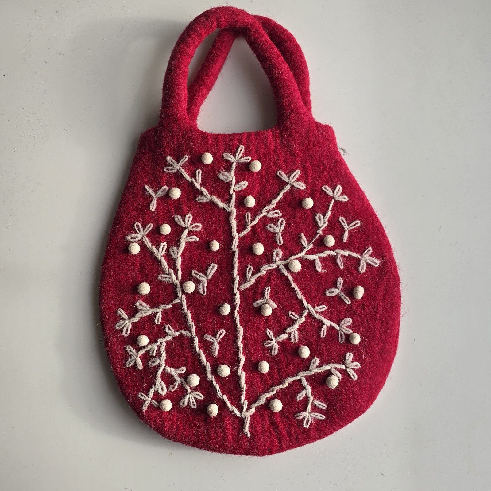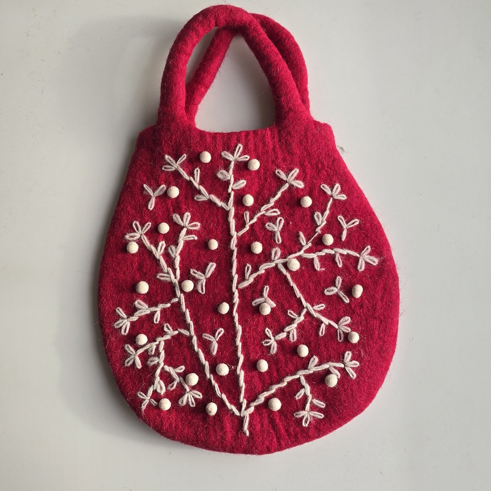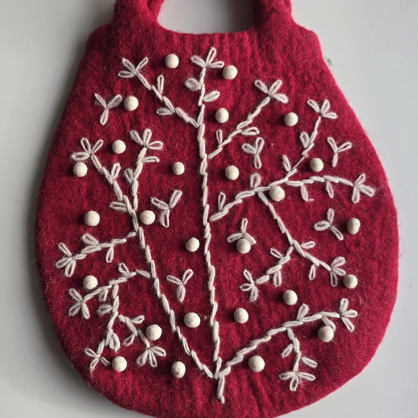 The Winter Berry Bag features delicate white embroidery inspired by bare winter branches and scattered berries, set against a rich red felted wool background. Handcrafted from natural wool, it offers a soft yet durable texture with beautiful artisanal detail. Its rounded shape and sturdy handles make it perfect for everyday use, seasonal outings, or as a statement accessory.